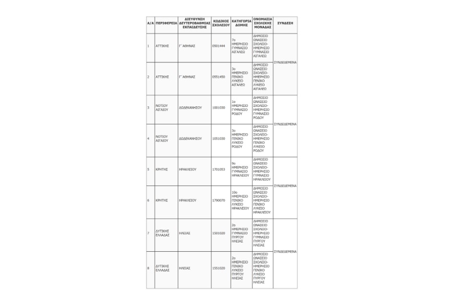 Οι 8 σχολικές μονάδες οι οποίες θα λειτουργήσουν από το σχολικό έτος 2026-2027 ως ΔΗΜ.Ω.Σ., καθώς και η μεταξύ τους σύνδεση σύμφωνα με την Υ.Α. (167401/Δ6/23-12-2025), παρουσιάζονται στον παρακάτω πίνακα: