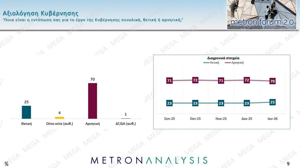 Αρνητική παραμένει η βαθμολογία συνολικά της κυβέρνησης, όπου το 70% έχει αρνητική γνώμη και μόνο το 25% θετική.