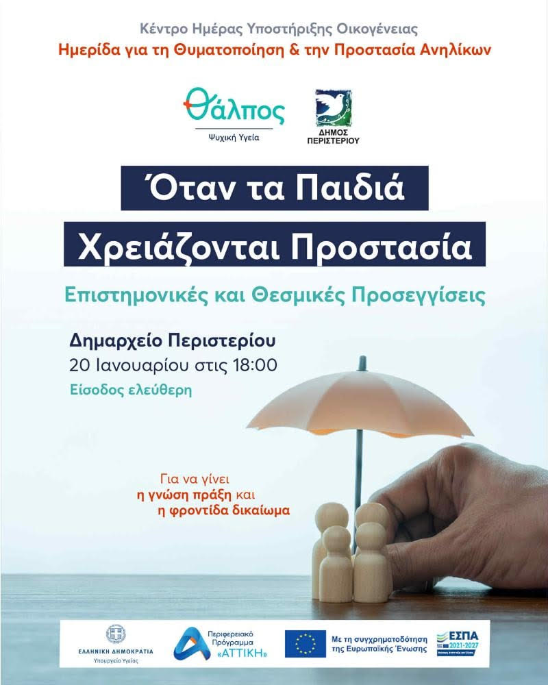 Ο Φορέας Ψυχικής Υγείας «Θάλπος», σε συνεργασία με τον Δήμο Περιστερίου, διοργανώνει ημερίδα με θέμα «Θυματοποίηση και Προστασία Ανηλίκων», την Τρίτη 20 Ιανουαρίου, στις 18:00, στο Συνεδριακό – Πολιτιστικό Κέντρο Δημαρχιακού Μεγάρου – στάση Μετρό «Περιστέρι»