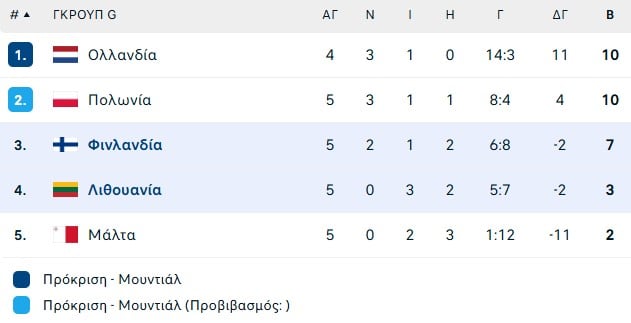 Η ήττα της Φινλανδίας από την Πολωνία (1-3) βάζει δύσκολα στην υπόθεση πρόκριση καθώς βρίσκεται στο «-3» από τις δύο πρώτες θέσεις. Από την αρχή της χρονιάς έχει χάσει 11 αγώνες και έχει υποχωρήσει στην 70η θέση του Ranking.