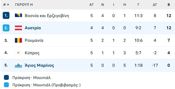 Η Βοσνία έχασε για πρώτη φορά μέσα στη χρονιά εντός έδρας από την Αυστρία (1-2), ενώ ήταν καλύτερη. Σημαντική απώλεια ο Χαϊραντίνοβιτς που είναι οργανωτής του παιχνιδιού της.