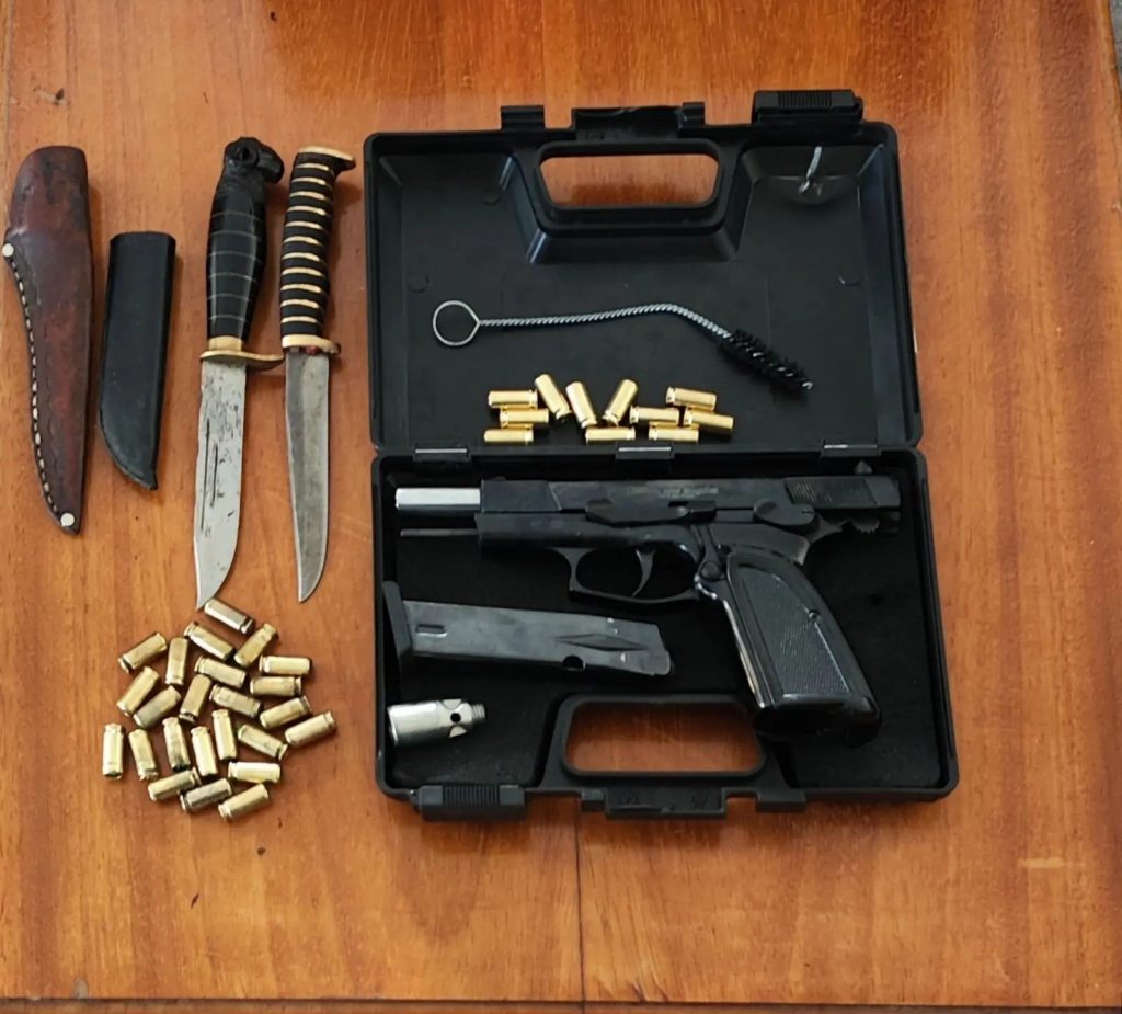 Από αστυνομικούς της Υποδιεύθυνσης Δίωξης και Εξιχνίασης Εγκλημάτων Αγίου Νικολάου και του Τμήματος Αστυνομικών Επιχειρήσεων Λασιθίου πραγματοποιήθηκε έρευνα στην οικία και το όχημα του 29χρονου και σε περιβάλλοντες χώρους κατά τη διάρκεια της οποίας βρέθηκαν και κατασχέθηκαν πιστόλι με γεμιστήρα και -11- φυσίγγια, -24- κάλυκες και 2 μαχαίρια.