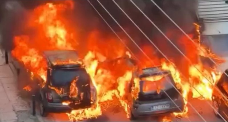 Η φωτιά ξεκίνησε από ένα ΙΧ που βρισκόταν εν κινήσει και γρήγορα επεκτάθηκε και στα άλλα τρία που ήταν παρκαρισμένα.