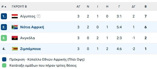 Στη συνέχεια (4/1) η Νότια Αφρική θα αγωνιστεί στη φάση των «16» στο Ραμπάτ με την ομάδα που τερματίσει 2η στον 6ο όμιλο, ενώ την επόμενη μέρα (5/1) στο Αγαδίρ η Αίγυπτος θα παίξει κάποια από τις καλύτερες 3ης από την ειδική βαθμολογία.