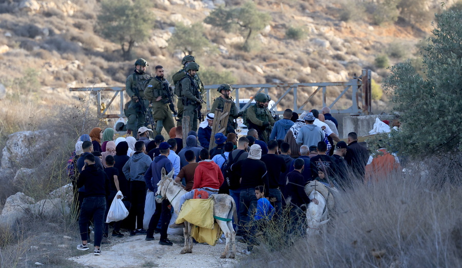 epa12541415 Israeli soldiers on guard as Palestinian farmers make their way to pass a gate giving them access to their olive feild close to the Alon More settelment near the West Bank village of Salem, near the West Bank city of Nablus, 22 November 2025. Farmers across the West Bank have faced repeated attacks by Israeli settlers and soldiers during the olive harvest season, in assaults often including physical violence, harassment, uprooting of trees, and blocking access to agricultural lands located near or within settlement areas. EPA/ALAA BADARNEH