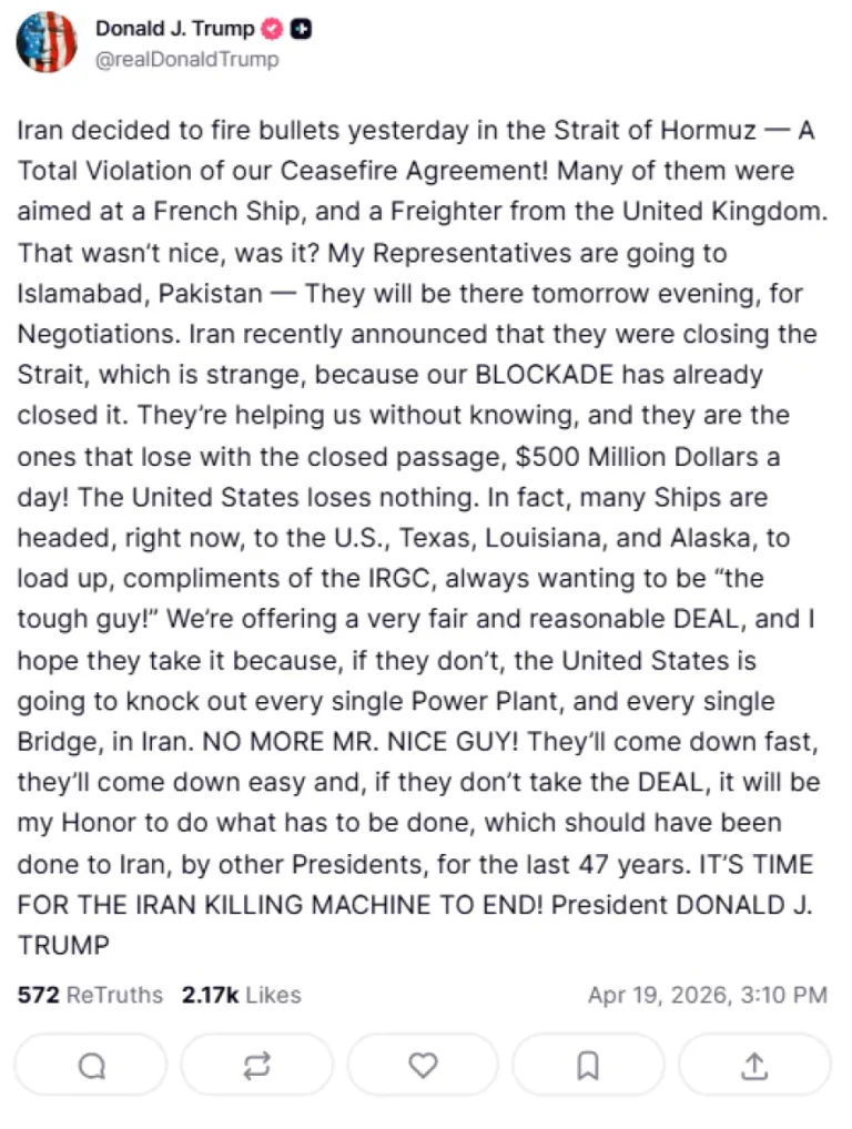 Το Ιράν αποφάσισε χθες να ρίξει πυροβολισμούς στο Στενό του Ορμούζ — Μια πλήρης παραβίαση της συμφωνίας κατάπαυσης του πυρός που έχουμε συνάψει! Πολλοί από αυτούς στόχευαν ένα γαλλικό πλοίο και ένα φορτηγό πλοίο από το Ηνωμένο Βασίλειο. Δεν ήταν και πολύ ωραίο αυτό, έτσι; Οι εκπρόσωποί μου πηγαίνουν στο Ισλαμαμπάντ του Πακιστάν — θα βρίσκονται εκεί αύριο το βράδυ, για διαπραγματεύσεις. Το Ιράν ανακοίνωσε πρόσφατα ότι θα κλείσει το Στενό, κάτι που είναι παράξενο, επειδή ο ΑΠΟΚΛΕΙΣΜΟΣ μας το έχει ήδη κλείσει. Μας βοηθούν χωρίς να το γνωρίζουν, και είναι αυτοί που χάνουν από το κλειστό πέρασμα, 500 εκατομμύρια δολάρια την ημέρα! Οι Ηνωμένες Πολιτείες δεν χάνουν τίποτα. Στην πραγματικότητα, πολλά πλοία κατευθύνονται, αυτή τη στιγμή, προς τις ΗΠΑ, το Τέξας, τη Λουιζιάνα και την Αλάσκα, για να φορτωθούν, χάρη στο IRGC, που θέλει πάντα να είναι «ο σκληρός τύπος»! Προσφέρουμε μια πολύ δίκαιη και λογική ΣΥΜΦΩΝΙΑ, και ελπίζω να την αποδεχθούν, γιατί, αν δεν το κάνουν, οι Ηνωμένες Πολιτείες θα καταστρέψουν κάθε μονάδα παραγωγής ηλεκτρικής ενέργειας και κάθε γέφυρα στο Ιράν. ΤΕΛΟΣ Ο Κ. ΚΑΛΟΣ! Θα πέσουν γρήγορα, θα πέσουν εύκολα και, αν δεν δεχτούν τη ΣΥΜΦΩΝΙΑ, θα είναι τιμή μου να κάνω ό,τι πρέπει να γίνει, κάτι που θα έπρεπε να είχαν κάνει άλλοι Πρόεδροι στο Ιράν τα τελευταία 47 χρόνια. ΕΙΝΑΙ ΩΡΑ ΝΑ ΤΕΡΜΑΤΙΣΤΕΙ Η ΜΗΧΑΝΗ ΘΑΝΑΤΟΥ ΤΟΥ ΙΡΑΝ! Πρόεδρος ΝΤΟΝΑΛΝΤ ΤΡΑΜΠ