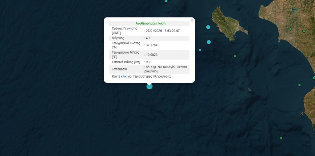 Σεισμός μεγέθους 4,7 βαθμών της κλίμακας Ρίχτερ σημειώθηκε το βράδυ της Τρίτης ανοιχτά της Ζακύνθου.