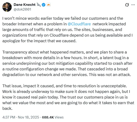Σε δήλωσή του, ο Διευθυντής Τεχνολογίας της Cloudflare, Ντέιν Κνεχτ, παραδέχθηκε ότι η εταιρεία απέτυχε απέναντι σε εκατομμύρια χρήστες και επιχειρήσεις σε όλο τον κόσμο. Στην ανάρτησή του ξεκαθάριζε ότι η διακοπή υπηρεσιών επηρέασε μεγάλα τμήματα του διαδικτύου, από εφαρμογές επικοινωνίας και πλατφόρμες streaming μέχρι εργαλεία τεχνητής νοημοσύνης, ηλεκτρονικά καταστήματα και ιστοσελίδες.