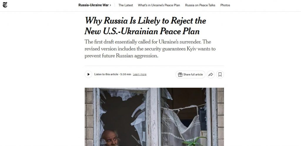 New York Times: Γιατί η Ρωσία θα απορρίψει και το νέο σχέδιο των 20 σημείων που ετοίμασαν ΗΠΑ και Ουκρανία
